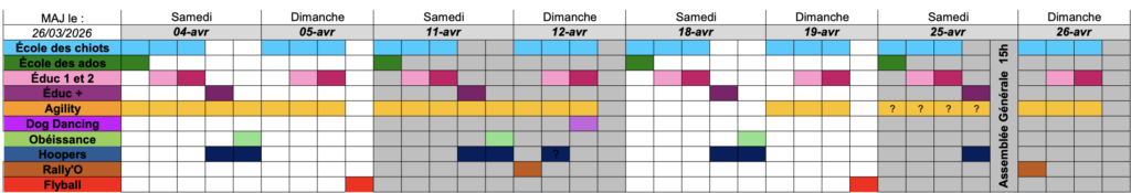 Planning / Inscription Formulaire d’inscription après le planning Quelques précisions :Les cours d’agility, dog dancing, obéissance et de rally-o sont réservés aux adhérents du club, après validation du responsable.Si vous n’avez pas pu vous rendre au cours précédent auquel vous vous êtes inscrit sans nous prévenir, vous n’êtes pas prioritaireLe parking du club sera réservé pour le staff Planning des Week-End Formulaire inscription CLOTURES DES INSCRIPTIONS VENDREDI 12H Inscriptions valides que si confirméesPas d’inscription pour les cours d’éducation. Veuillez activer JavaScript dans votre navigateur pour remplir ce formulaire.Veuillez activer JavaScript dans votre navigateur pour remplir ce formulaire.Jour *Mercredi uniquement compétiteurSamediDimancheActivités selon planning *Sélectionner votre activitéEcole des chiots 3 mois 9h30 - 10h15Ecole des chiots 4 mois 10h30 - 11h15Ecole des chiots 5 mois 11H30 - 12h15Cours découverteEcole des ados 9h - 10hEduc+ 14h - 15hAgility débutant Samedi 9h - 10h15Agility débutant Dimanche 9h30 - 10h30Agility intermédiaire 10h30 - 11h30Agility Loisirs ++ 11h30 - 12h30Dog Dancing 11h - 12hHoopers N2-N3 10h-11hHoopers N1-N2 13h30 - 15h00Hoopers N0 15h15 - 16h15Hoopers Débutant 16h15 - 17h15Obéissance enchainement 15h - 16hRally O 9h - 10hAgility Grade 1-2Agility Grade 3Adhérent *PrénomNomPRENOM DE VOTRE CHIEN *Race du chien * naissance Adhérent PRENOM Date naissance du chien *E-mail *Téléphone *Numéro adhérent *CommentaireSi cours découverte spécifier pour quels cours : Chiot, éducation, adosEnvoyer Cliquez ici