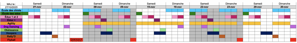 Planning / Inscription Formulaire d’inscription après le planning ATTENTION CLOTURE DES INSCRIPTIONS LE VENDREDI 12h.Une confirmation vous sera envoyée pour validation de votre cours Quelques précisions :Les cours d’agility, dog dancing, obéissance et de rally-o sont réservés aux adhérents du club, après validation du responsable.Si vous n’avez pas pu vous rendre au cours précédent auquel vous vous êtes inscrit sans nous prévenir, vous n’êtes pas prioritaireLe parking du club sera réservé pour le staff Planning des Week-End Formulaire inscription CLOTURES DES INSCRIPTIONS VENDREDI 12H Inscriptions valides que si confirméesPas d’inscription pour les cours d’éducation. Veuillez activer JavaScript dans votre navigateur pour remplir ce formulaire.Veuillez activer JavaScript dans votre navigateur pour remplir ce formulaire.Jour *Mercredi uniquement compétiteurSamediDimancheActivités selon planning *Sélectionner votre activitéEcole des chiots 3 mois 9h30 - 10h15Ecole des chiots 4 mois 10h30 - 11h15Ecole des chiots 5 mois 11H30 - 12h15Cours découverteEcole des ados 9h - 10hEduc+ 14h - 15hAgility débutant 9h - 10h15Agility intermédiaire 10h30 - 11h30Agility Loisirs ++ 11h30 - 12h30Dog Dancing 11h - 12hHoopers N1-N2 13h00 - 15h00Hoopers N0 15h15 - 16h15Hoopers Débutant 16h15 - 17h15Obéissance enchainement 15h - 16hRally O 9h - 10hAgility Grade 1Agility Grade 2_3Adhérent *PrénomNomPRENOM DE VOTRE CHIEN *Race du chien *Date naissance du chien *E-mail *Téléphone * CHIEN chien VOTRE Numéro adhérent *CommentaireSi cours découverte spécifier pour quels cours : Chiot, éducation, adosEnvoyer Cliquez ici